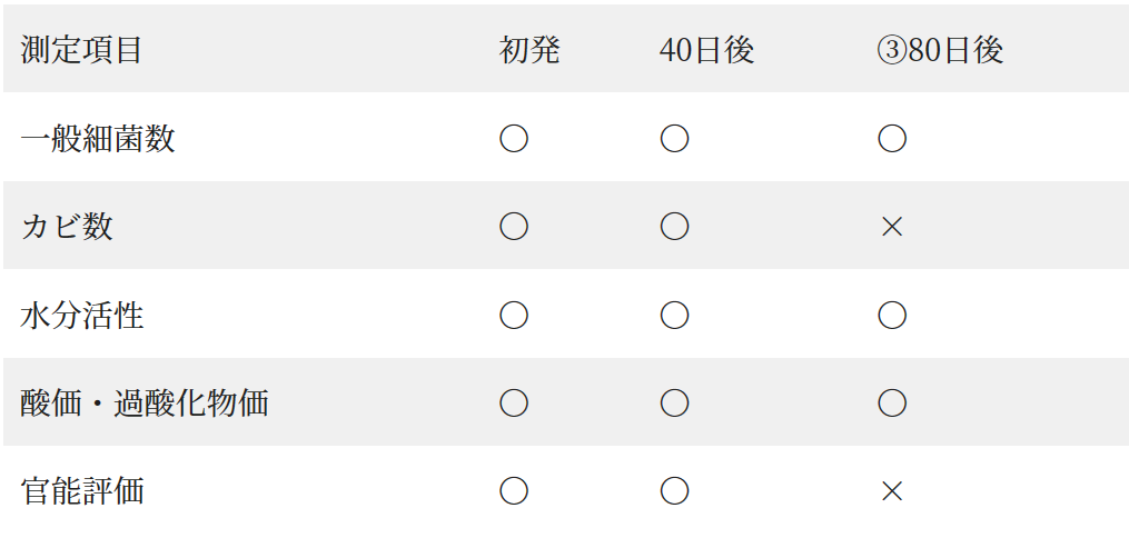 80日後はカビ数・官能検査が×となっていますので、40日で計算します