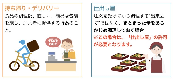 テイクアウト・デリバリーとは、客席に提供する場合と同様に、食品の調理後、直ちに、簡易な包装を施し、注文者に提供する行為のこと。但し、注文を受けてから調理する“出来立て”ではなく、まとまった量をあらかじめ調理しておく場合は、「仕出し屋」の許可が必要となります。