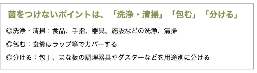 食中毒の原因となる、細菌やウイルス等を食品につけないこと。手洗いや、調理器具の洗浄、調理する際のマスク着用も有効。