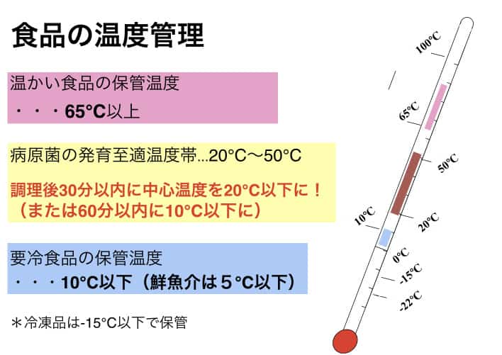 • 65℃以上か10℃以下で保存し、微生物の増加を防ぐ   ようにしましょう。