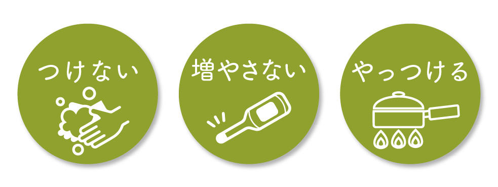 細菌やウイルスを【つけない】【ふやさない】【やっつける】が食中毒予防の3原則です。